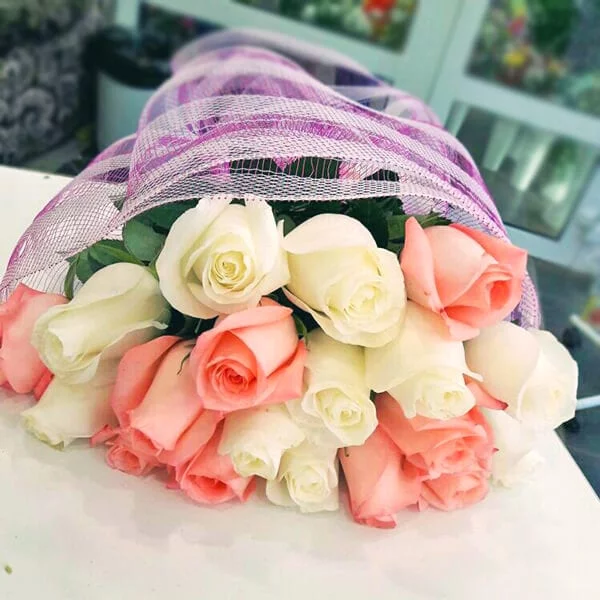 Роза белая (кремовая) и розовая 70 см - 19 шт , упаковка фетр.