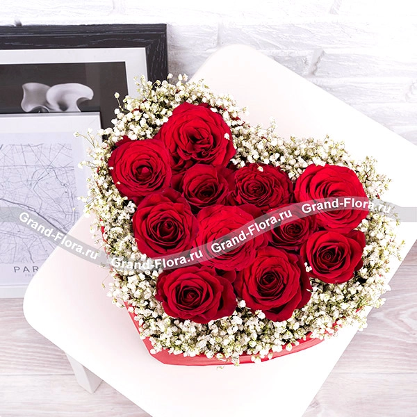 11 роз (на фото): роза красная - 11 шт., гипсофила, оазис сердце малое. Примерный размер: 25Х25 см.