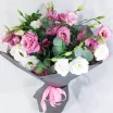 Стандартный: эустома розовая - 7 шт., эустома белая - 4 шт., декоративная зелень, упаковка крафт, лента розовая.
